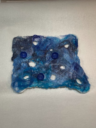 thicker by adding more layers which is sometimes refered to as ‘painting’ the surface with coloured fleece. Once this stage is completed you apply warm water and soap and start to fuse the fibres. This is then followed by rolling the felt to immitate a dryer, this coninues to fuse the fibres once again. Finally I like to shock the felt by washing it in cold water then immediatly hot water this also helps with the fuseing procees and removes the soap.